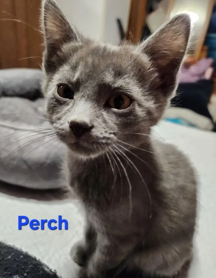 Perch was the smallest of his litter but also the bravest—he was the first to meet the resident cats and dog! He’s also known for his big purr and adorable habit of gently licking and nibbling fingers.