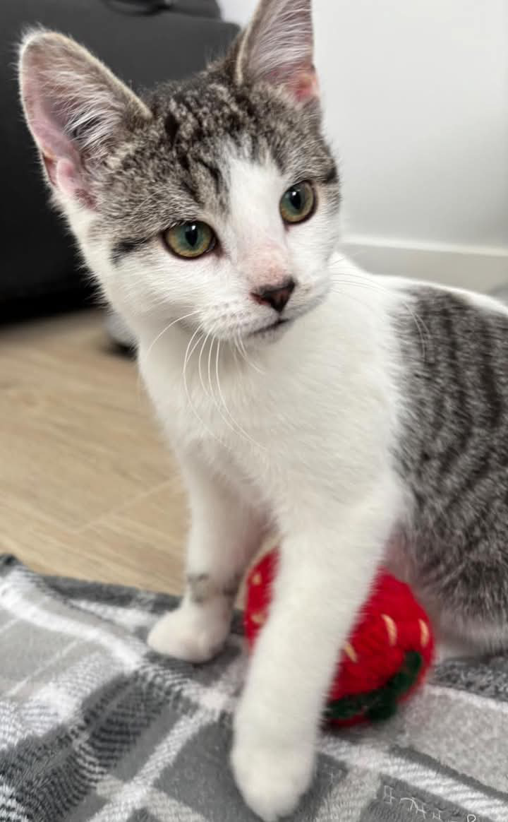 Pixie is a tiny ball of fearless fun with spunky, endless energy. She’s always on the move — chasing toys, wrestling with her foster roommate Honey, and zooming around like she owns the place. Pixie is confident, entertaining, and full of kitten curiosity.