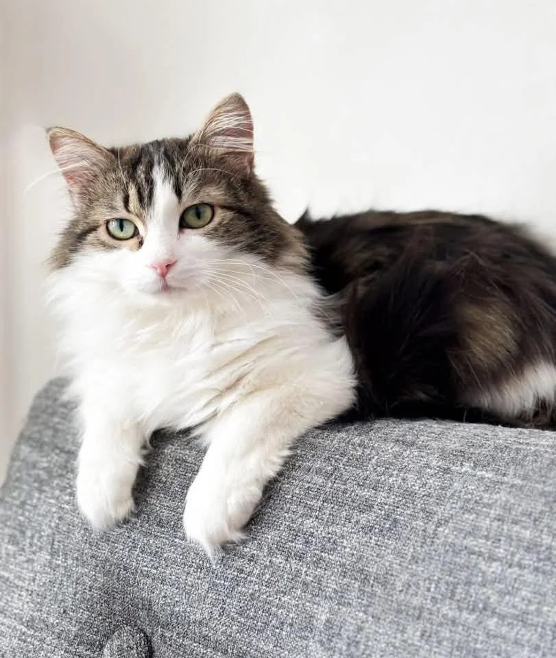 Snowflake is a petite, affectionate girl who absolutely loves attention from her people. She will happily jump down to greet you at the door and show her affection with gentle head butts, rubbing against your legs, and flopping over in front of you for pets.